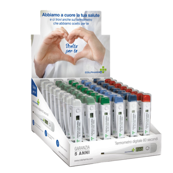 Termometro digitale con rilevazione della temperatura corporea in ca. 60 secondi con segnale acustico che suona al termine della misurazione e spegnimento automatico dopo 10 minuti dal mancato utilizzo.